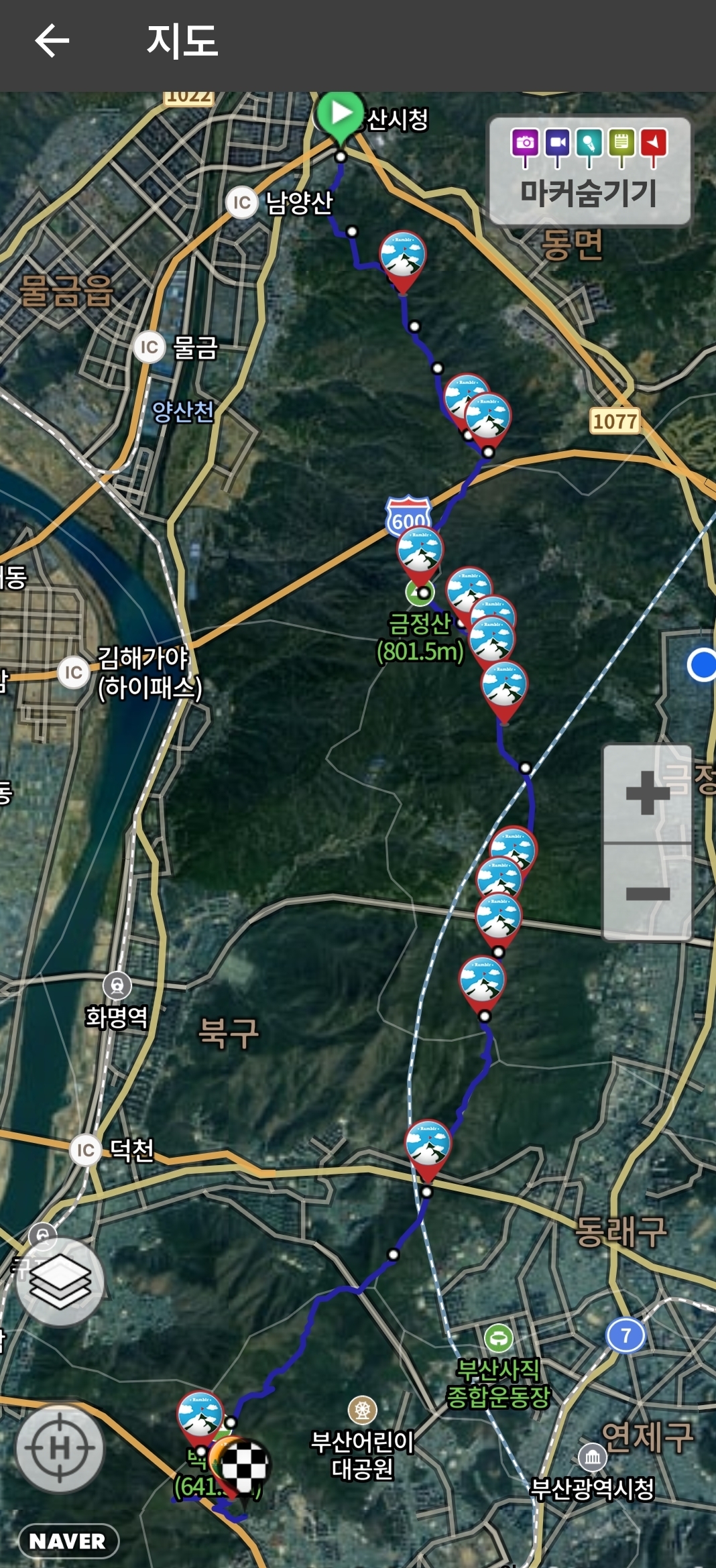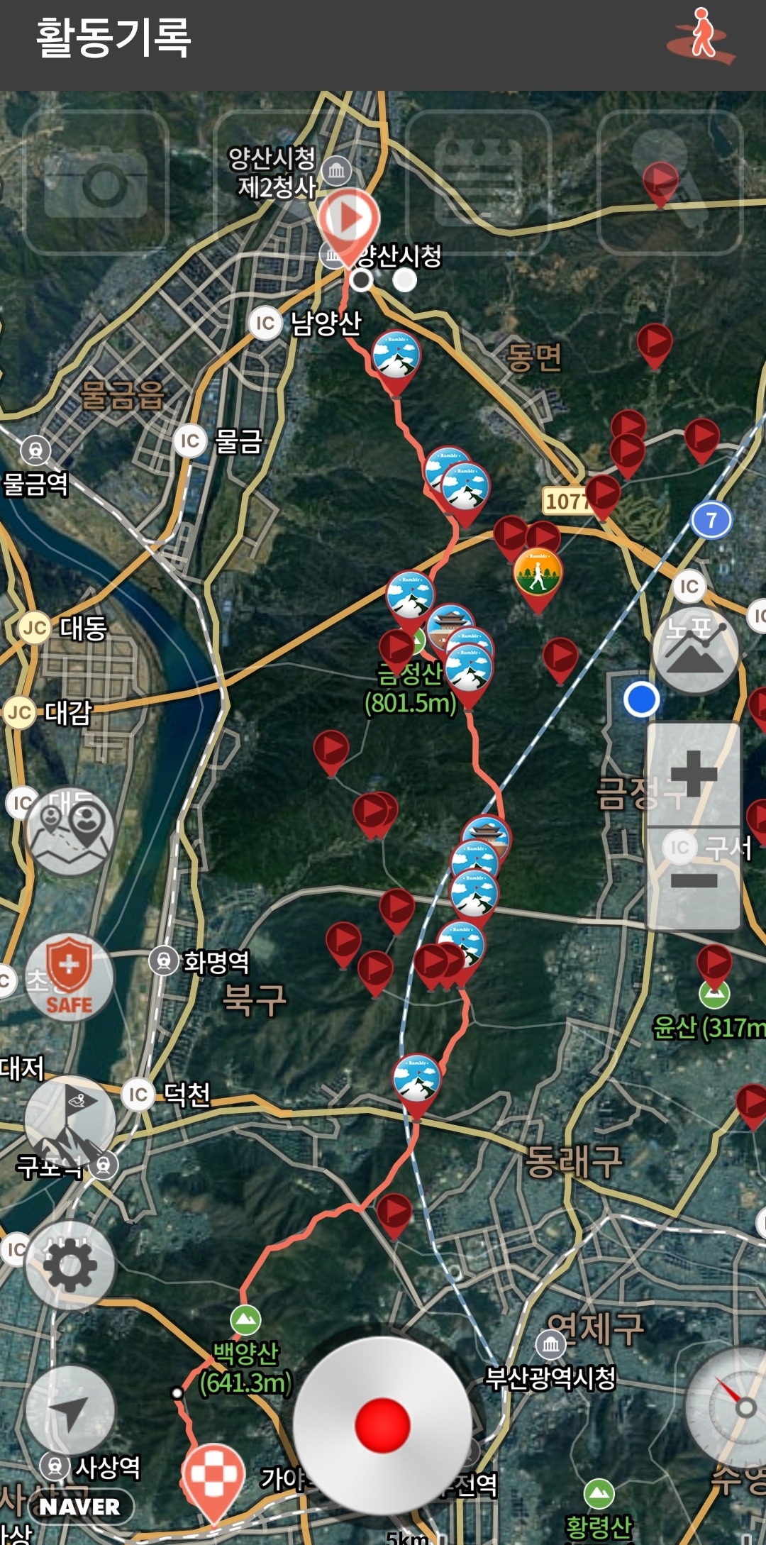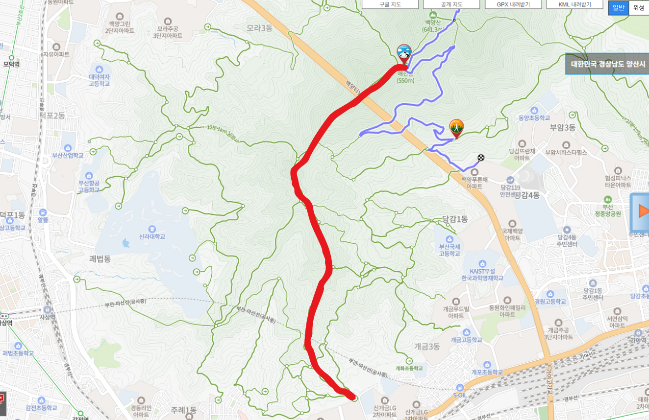 🌄 위 지도를 살펴보면 여기서 부터 나는 정상경로에서 약간 벗어나 개금 백양 푸른채 아파트쪽으로 내려왔고, 대부분은 빨간 색의 보정해 놓은 선처럼 개림 초등학교쪽으로 내려옵니다.