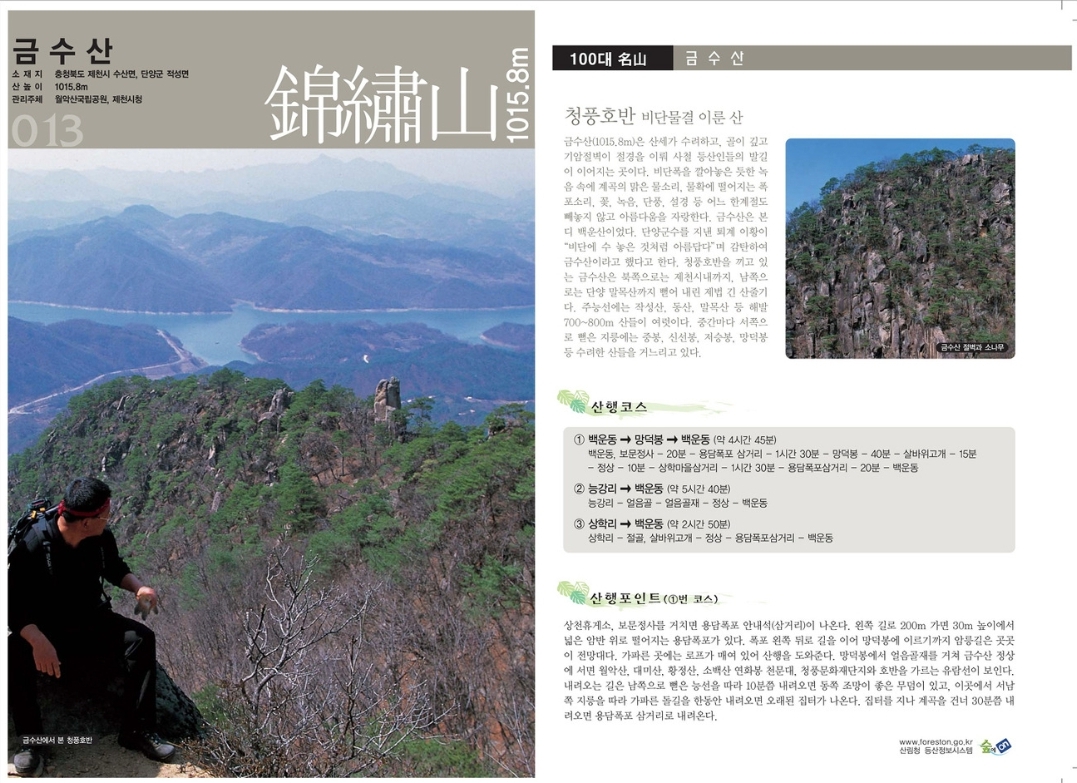 - 등산로: 대표적인 등산 코스로는 상천주차장에서 시작해 용담폭포와 망덕봉(926m)을 거쳐 금수산 정상에 오르는 길이 있습니다. 이 코스는 왕복 약 5시간 정도 소요되며, 경치가 좋은 것으로 알려져 있습니다. 또한 용추폭포와 선녀탕 등 명소를 지나며 산행을 즐길 수 있습니다.