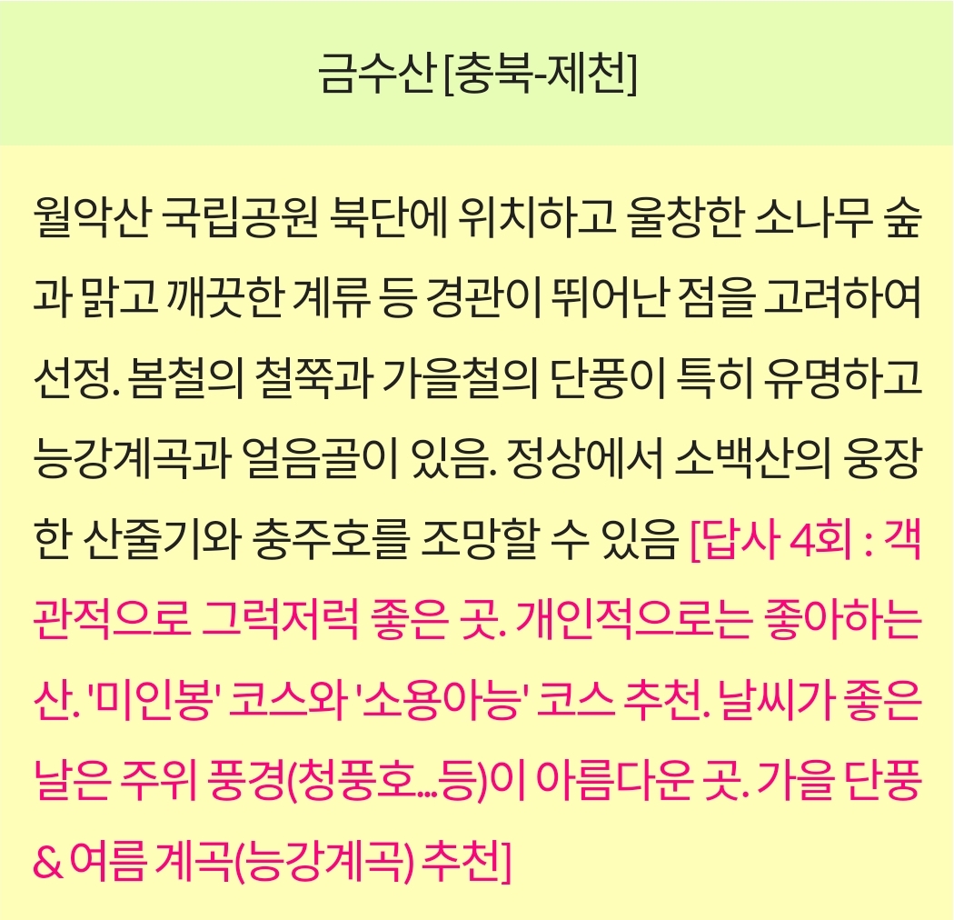 - 자연경관: 금수산은 충주호(청풍호)와 인접해 있어, 정상에서 호수를 비롯한 주변의 산세를 조망할 수 있는 멋진 전망을 제공합니다. 특히 가을 단풍철에 많은 등산객이 찾으며, 맑은 날에는 월악산 영봉까지 보이는 경치가 일품입니다.