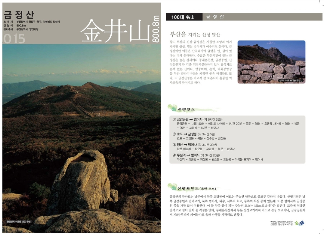 부산광역시 금정구와 경상남도 양산시에 걸쳐 있는 산으로, 높이는 801.5미터입니다. 금정산은 부산을 대표하는 명산 중 하나로, 다양한 등산로와 역사적 유산으로 유명합니다.