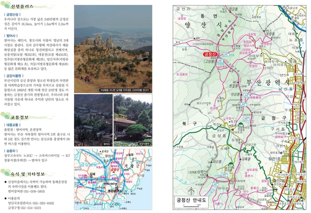 - 자연경관: 금정산은 부산 시내에서 쉽게 접근할 수 있는 산으로, 산 정상에서는 부산 전역과 낙동강, 그리고 멀리 대한해협까지 조망할 수 있습니다. 봄철에는 진달래와 철쭉이 만개하여 많은 등산객들이 찾습니다.