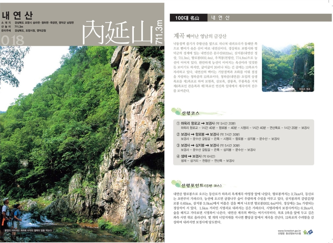 - 등산로: 내연산의 주요 등산로로는 보경사에서 출발해 12폭포를 지나 정상에 이르는 코스가 있습니다. 이 코스는 왕복 약 5~6시간이 소요되며, 다양한 폭포와 계곡을 따라 걷는 경로로, 특히 여름철과 가을철에 인기가 많습니다. 또 다른 코스로는 청하면에서 출발해 송라면으로 이어지는 종주 코스도 있습니다.