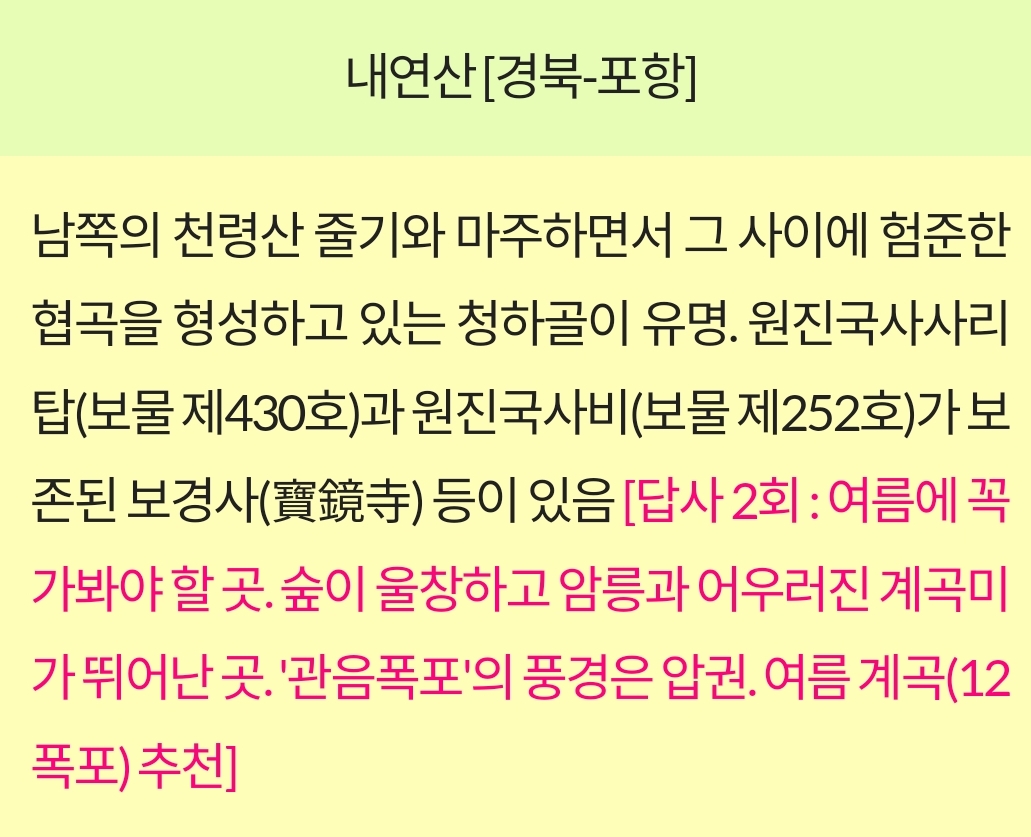 내연산은 그 자연경관의 아름다움과 더불어 역사적, 문화적 가치가 높은 명산으로, 많은 등산객과 관광객들에게 사랑받고 있는 명소입니다.