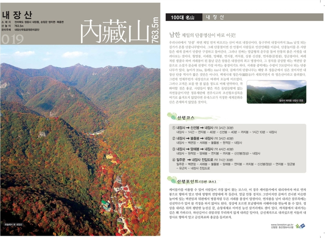 전라북도 정읍시 내장동에 위치한 산으로, 높이는 763미터입니다. 내장산은 한국의 대표적인 단풍 명소로 알려져 있으며, 매년 가을철이면 수많은 관광객이 방문하는 곳입니다.