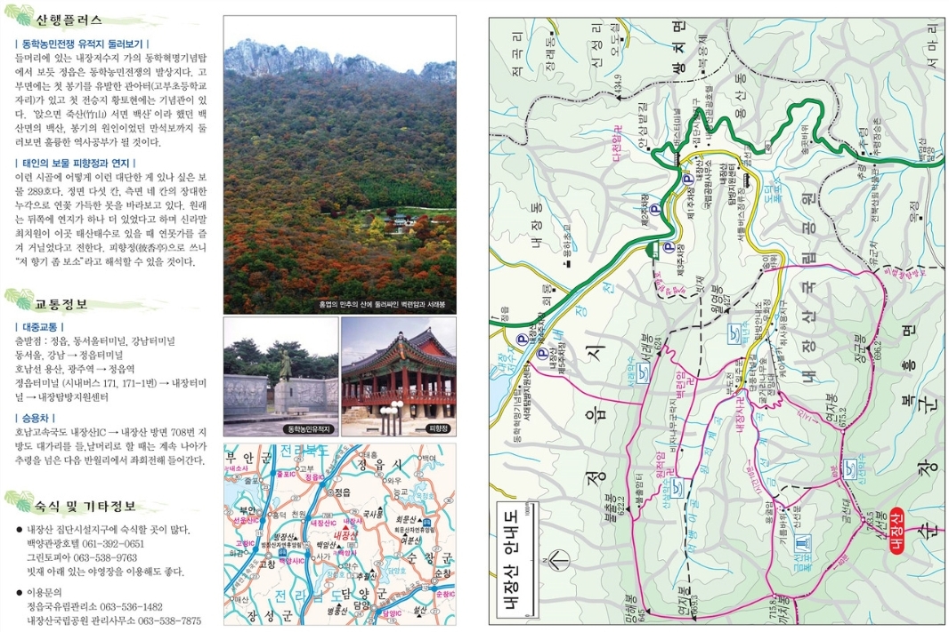 - 등산로: 내장산에는 다양한 등산로가 있으며, 그중에서 가장 인기 있는 코스는 내장사에서 출발해 정상인 신선봉에 이르는 길입니다. 이 코스는 왕복 약 4~5시간이 소요되며, 중간중간 아름다운 경치를 감상할 수 있는 전망대가 있습니다. 또 다른 주요 등산로로는 원적암에서 출발해 신선봉을 거쳐 내장사로 내려오는 코스가 있습니다.