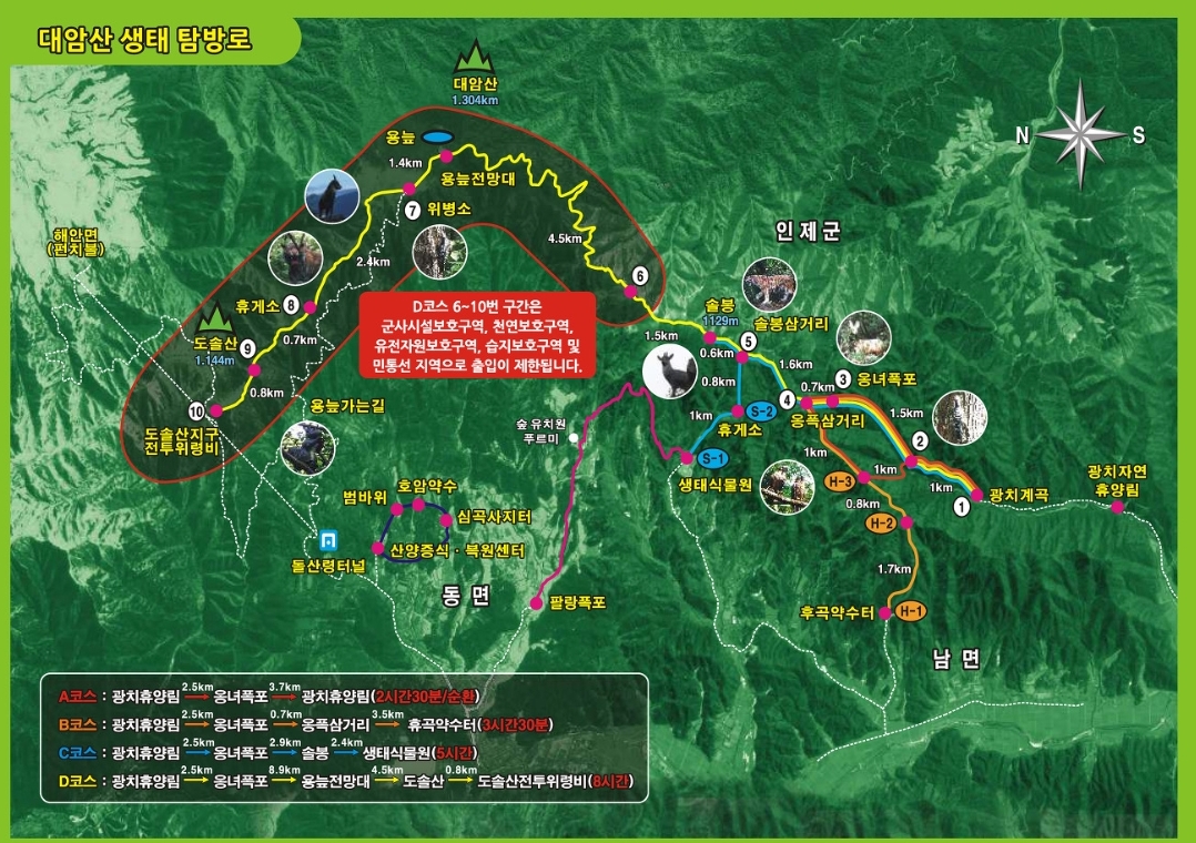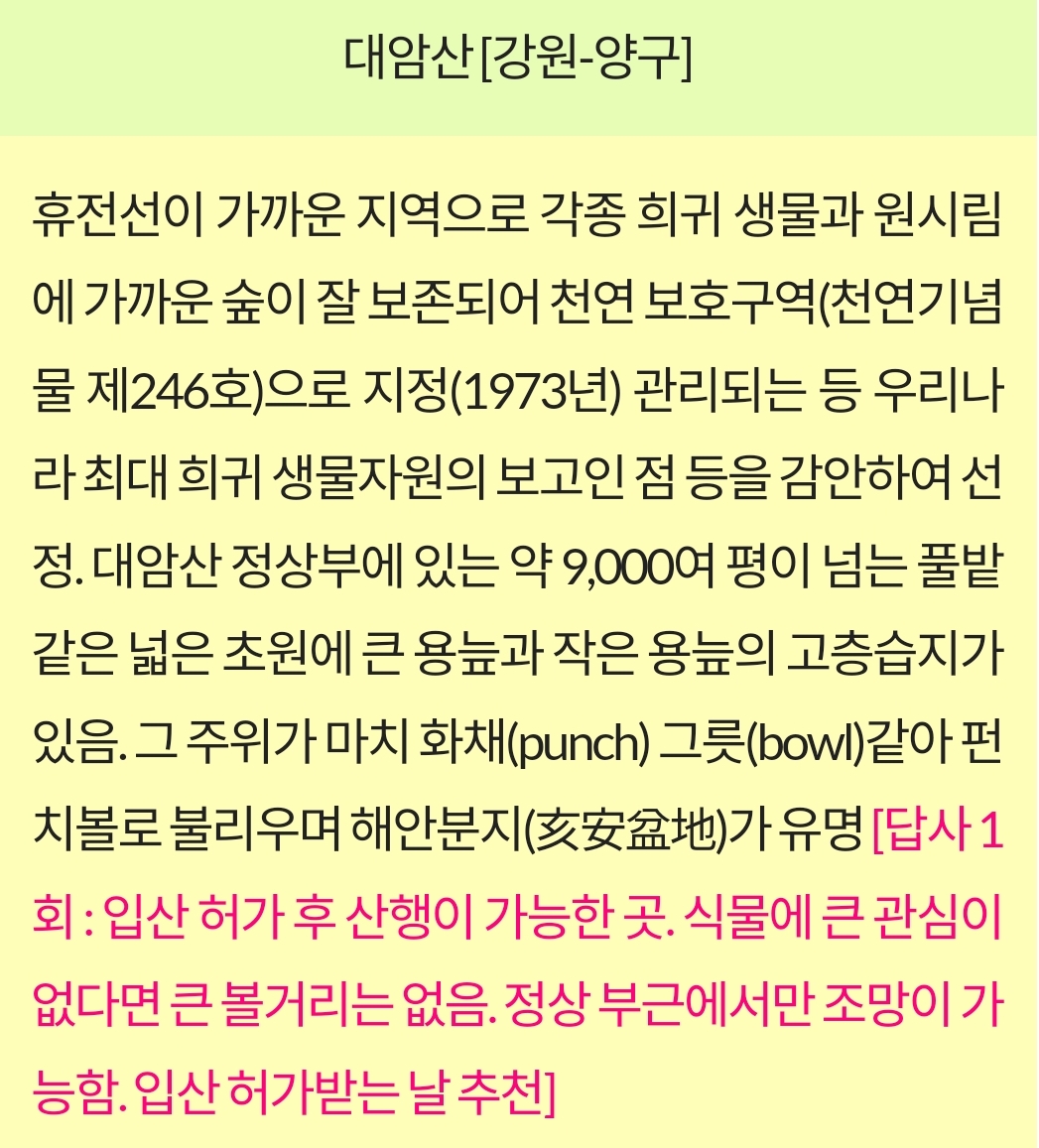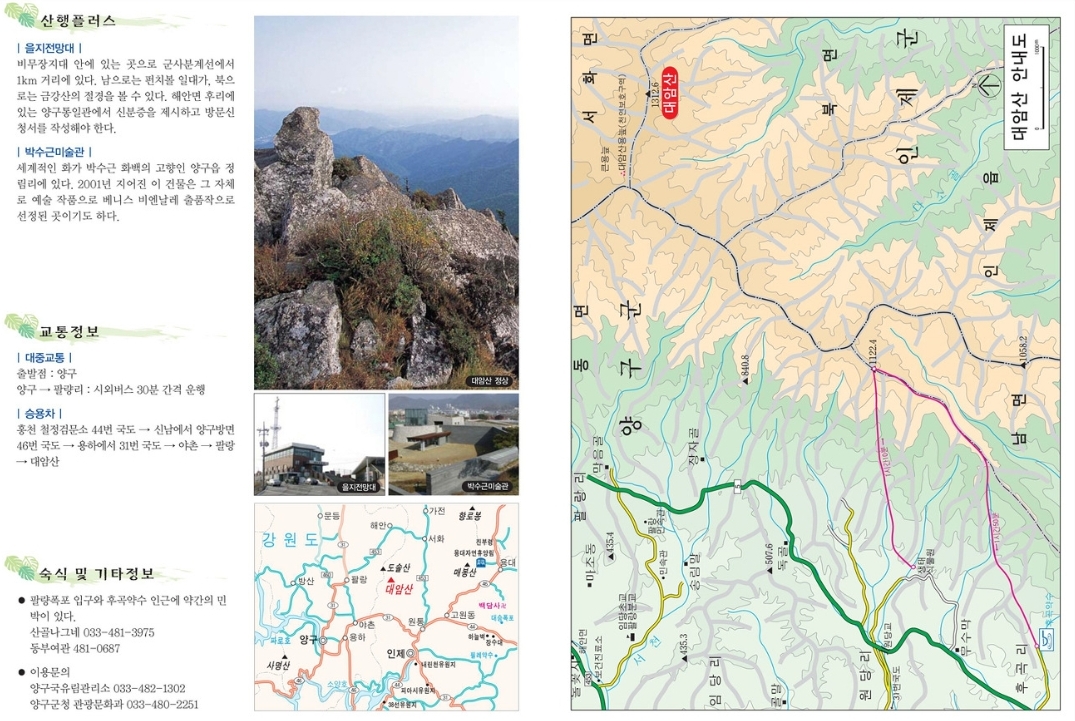 - 역사적 의미: 대암산 일대는 6.25 전쟁 당시 격전지였으며, 현재도 일부 지역은 민간인의 출입이 제한됩니다. 그로 인해 이 지역의 자연환경은 잘 보존되어 있으며, 산행 중에는 자연 그대로의 모습을 감상할 수 있습니다.