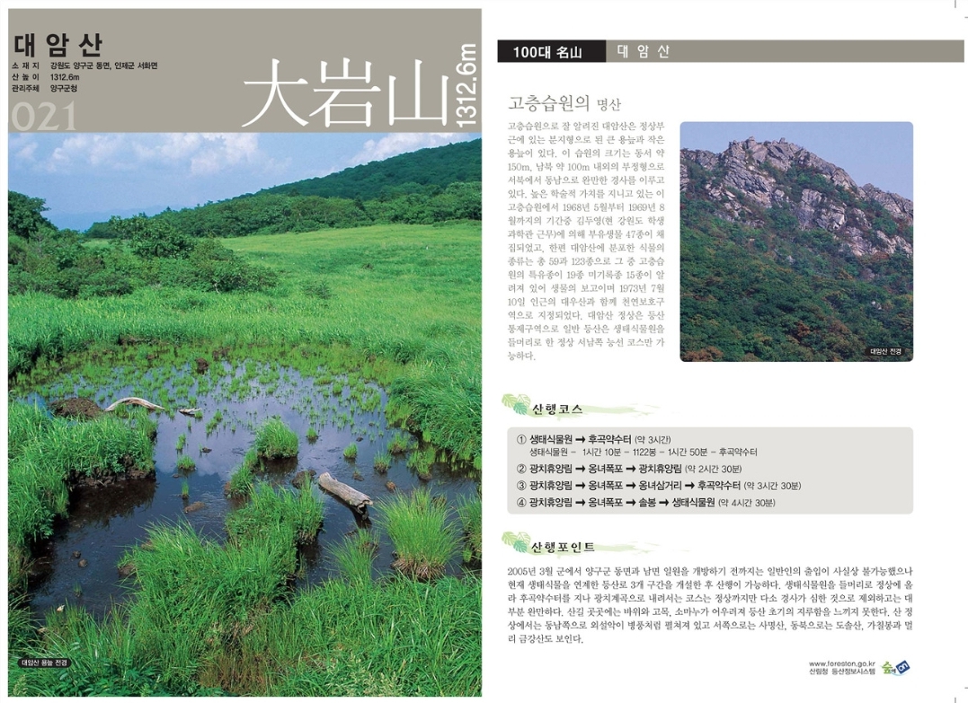 - 자연경관: 대암산은 고층 습원인 용늪으로 유명합니다. 이곳은 국내 최초로 람사르 협약에 등록된 습지로, 희귀 식물과 다양한 생물들이 서식하는 곳입니다. 용늪의 생태계는 매우 민감하여 보호가 필요한 지역으로 지정되어 있습니다.
