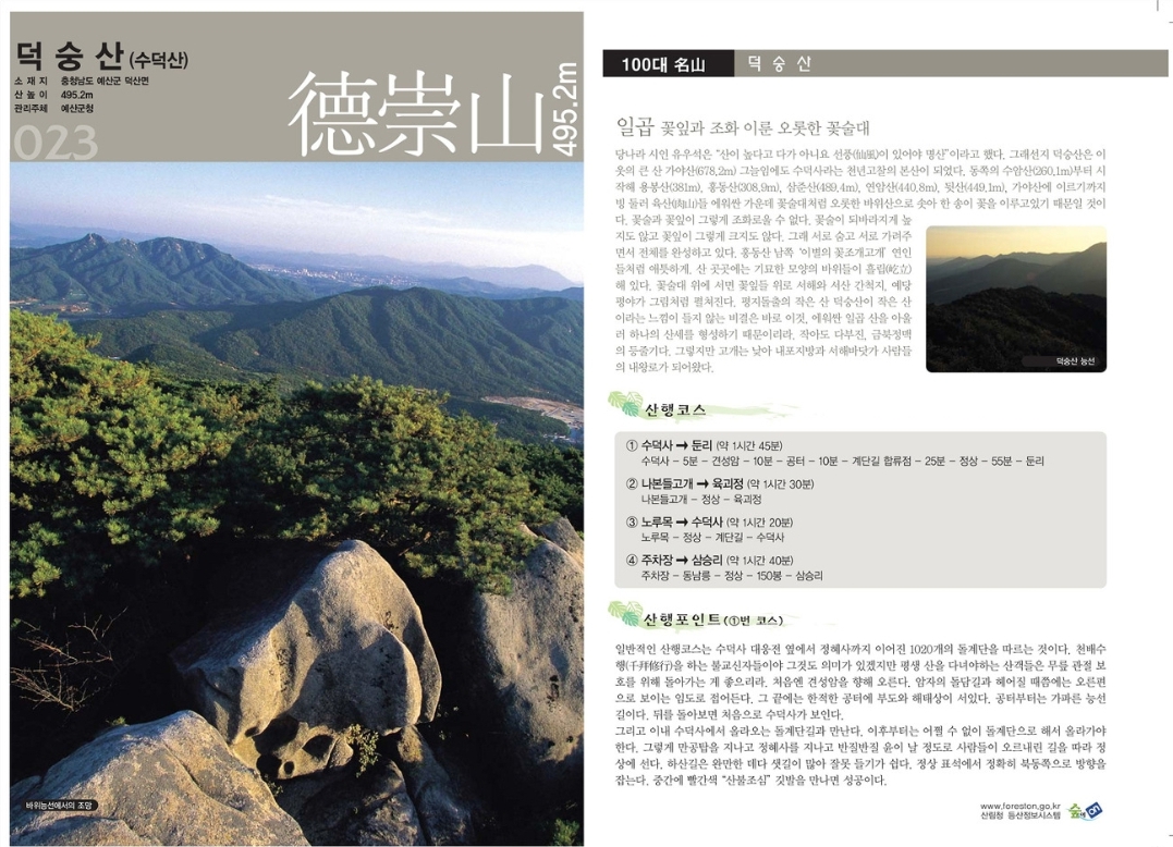 덕숭산은 자연경관과 역사적 유산이 조화를 이루는 명소로, 특히 가을철 산행지로 인기가 높습니다. 가족 나들이나 문화탐방을 겸한 등산 코스로도 추천할 만한 곳입니다.