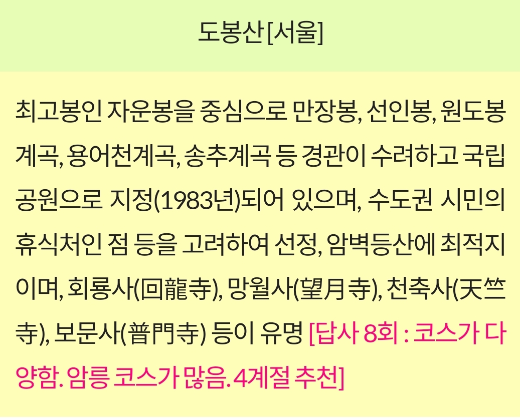 도봉산은 접근성이 뛰어나고 다양한 등산 코스와 함께 문화유산이 잘 보존된 곳으로, 서울 시민뿐만 아니라 전국의 등산객들에게 사랑받고 있는 명산입니다.