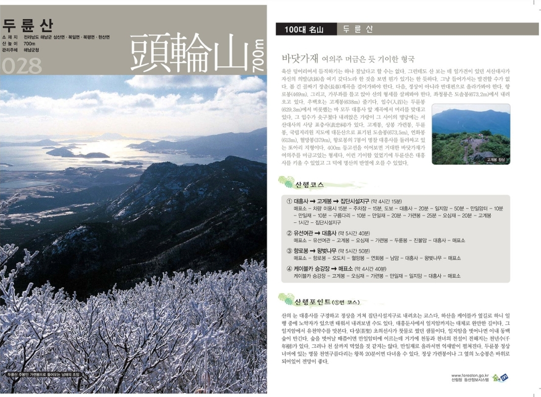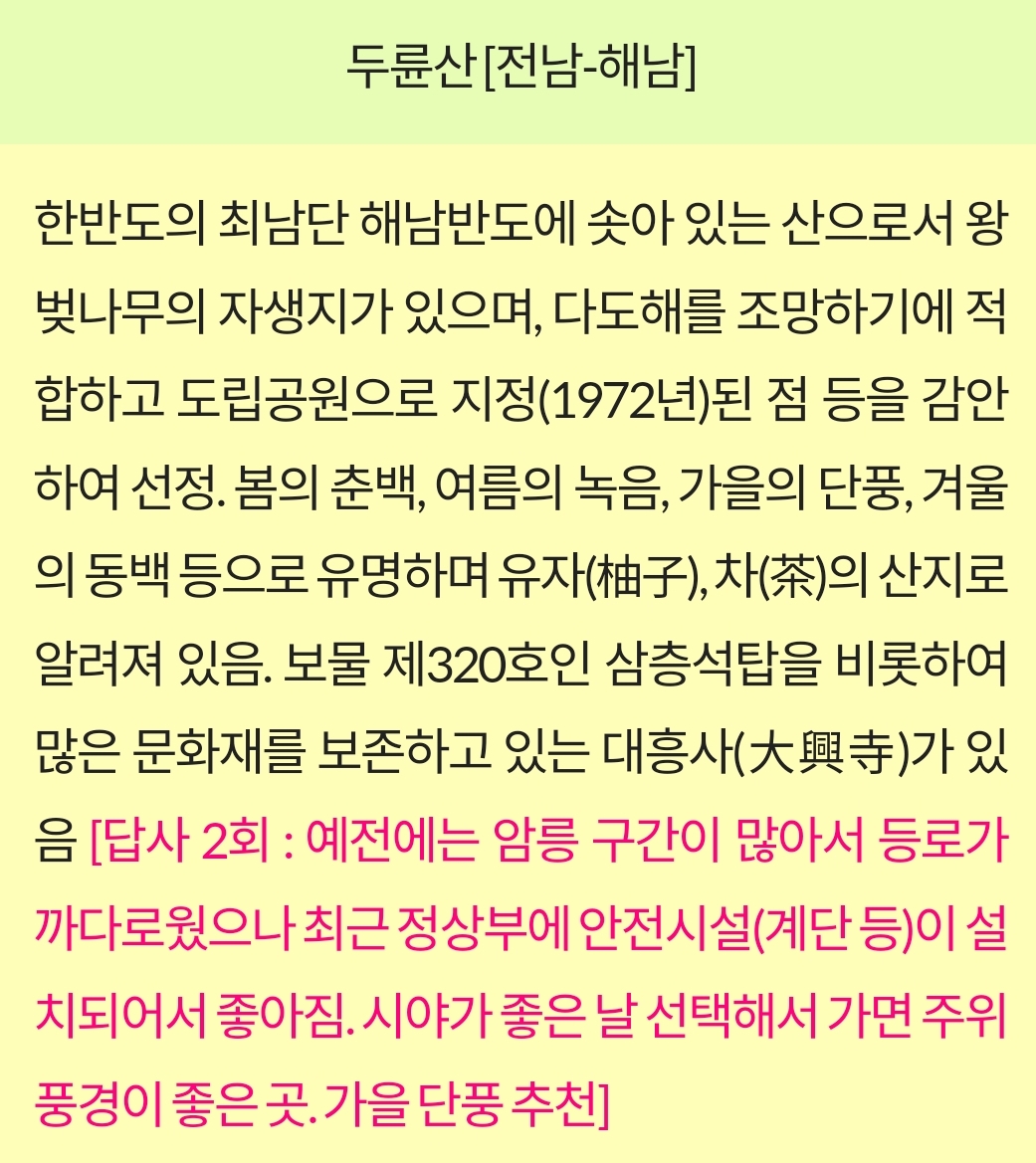 두륜산은 그 아름다운 자연경관과 문화유산으로 인해 많은 등산객과 관광객들에게 사랑받는 명산입니다. 사계절 내내 다양한 매력을 지닌 이 산은 특히 봄과 가을철에 많은 이들이 찾습니다.