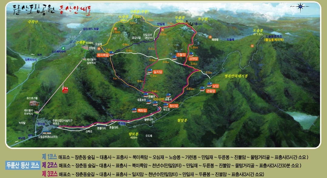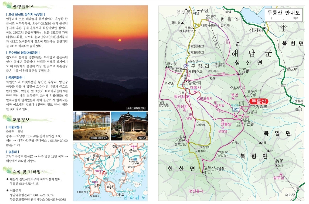 - 등산로: 두륜산의 주요 등산로는 대흥사에서 시작해 가련봉, 노승봉, 두륜봉 등을 거쳐 다시 대흥사로 돌아오는 코스입니다. 이 코스는 약 5시간이 소요되며, 산행 중 다양한 명소를 지나며 아름다운 경관을 즐길 수 있습니다. 특히 가련봉에서의 조망이 매우 뛰어나며, 남해의 다도해를 한눈에 볼 수 있습니다.