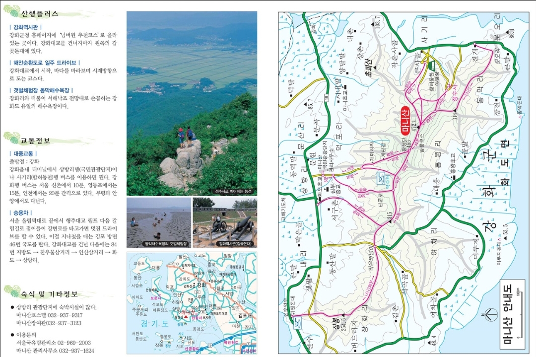 - 자연경관: 마니산은 강화도에서 가장 높은 산으로, 정상에서 바라보는 서해의 풍경이 아름답습니다. 특히, 마니산은 그 자체로도 자연경관이 빼어나지만, 주변의 바다와 섬들이 어우러져 한층 더 멋진 풍경을 자랑합니다. 사계절 내내 다른 매력을 보여주는 산으로, 봄에는 진달래와 철쭉이, 가을에는 단풍이 아름답습니다.