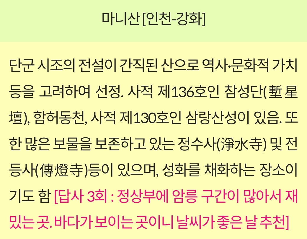 - 문화유산: 마니산에는 단군이 하늘에 제사를 지냈다는 전설이 담긴 참성단이 있습니다. 이 유적지는 단군 신화와 관련된 중요한 문화재로, 매년 개천절에 이곳에서 제천 의식이 거행됩니다. 참성단은 사적으로 지정되어 있으며, 한국의 고대사와 관련된 중요한 유적지입니다.