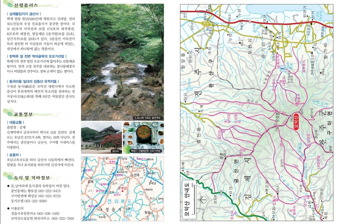 - 등산로: 모악산의 주요 등산로로는 김제시 금산면 금산사를 기점으로 하여 정상에 이르는 코스가 있습니다. 이 코스는 왕복 약 4시간이 소요되며, 정상에서는 전라북도 일대의 아름다운 풍경을 감상할 수 있습니다. 또 다른 인기 있는 코스로는 완주군 쪽에서 출발하는 길이 있으며, 이 코스 역시 경관이 뛰어나 많은 사람들이 이용합니다.