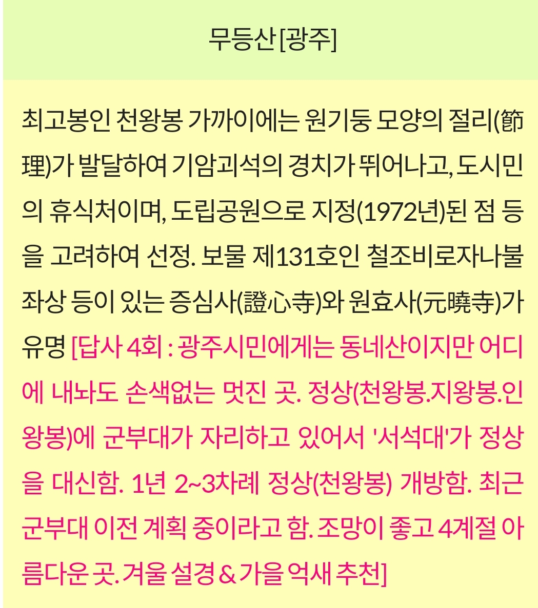 무등산은 그 웅장한 자연경관과 더불어 다양한 생태계, 역사적 유산이 어우러져 사계절 내내 많은 이들이 찾는 명산입니다. 특히, 가을철 단풍과 겨울철 눈 덮인 산의 모습이 특히 아름답습니다.