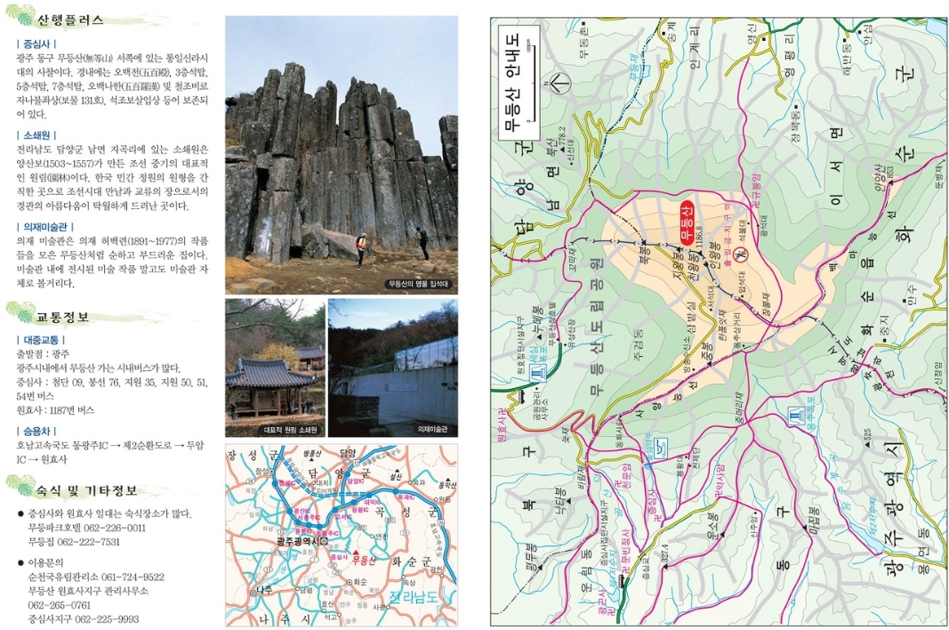 - 등산로: 무등산에는 다양한 등산로가 마련되어 있으며, 광주 시내에서 쉽게 접근할 수 있는 길부터 비교적 긴 거리의 등산로까지 선택의 폭이 넓습니다. 주요 등산 코스로는 무등산국립공원관리소에서 출발해 정상인 천왕봉까지 오르는 코스가 있으며, 왕복 약 4시간이 소요됩니다. 또 다른 코스로는 원효사에서 출발해 서석대와 입석대를 거쳐 정상에 이르는 길이 있습니다.