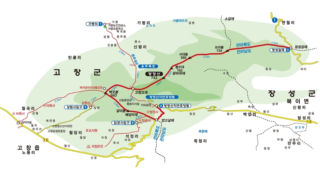 - 행정구역: 전라남도 장성군 북이면, 전라북도 고창군 신림면, 정읍시 입암면
