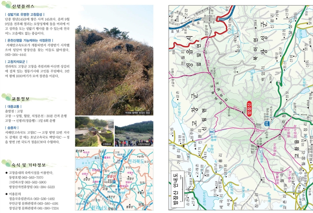 등산로:방장산의 대표적인 등산로로는 **방장산자연휴양림**에서 출발하는 코스가 있습니다. 이 코스는 약 2시간 정도 소요되며, 초보자도 쉽게 산행을 즐길 수 있는 완만한 길이 특징입니다. 또한, 장성갈재에서 출발하여 쓰리봉과 벽오봉을 거쳐 양고살재로 이어지는 종주코스는 약 6시간이 소요되는 중급자용 코스로, 다양한 봉우리를 지나며 산행의 묘미를 즐길 수 있습니다.