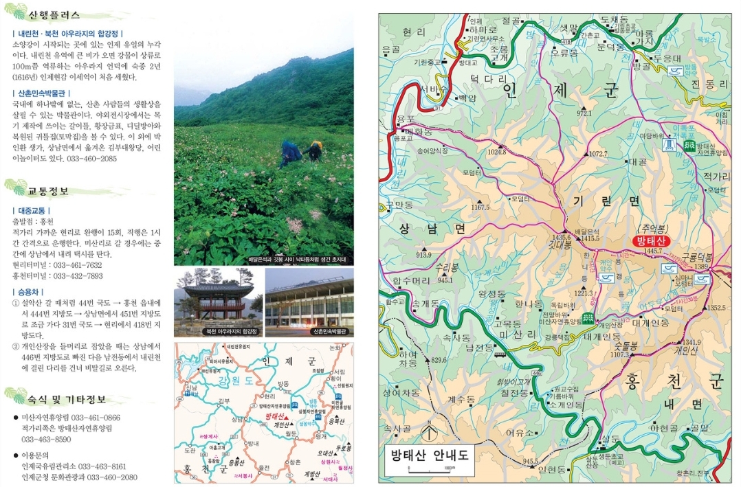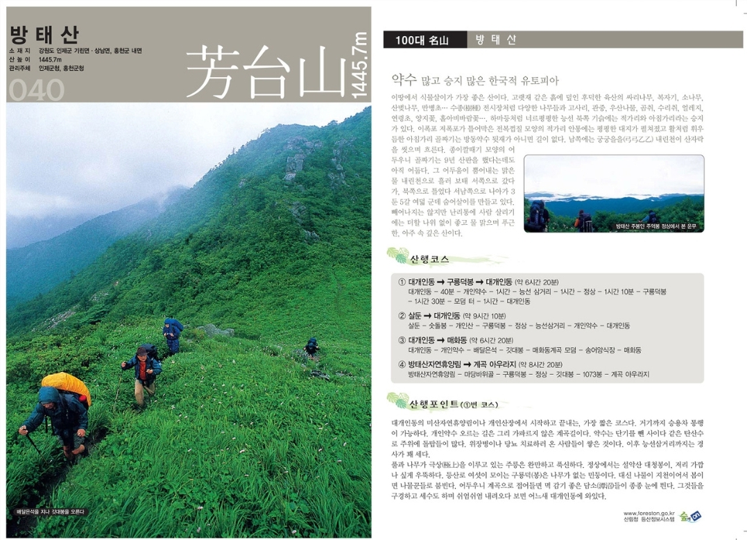 강원도 인제군 기린면과 상남면, 홍천군 내면에 걸쳐 있는 산으로, 높이는 1,444미터입니다. 방태산은 울창한 원시림과 다양한 생태계가 잘 보존된 지역으로, 한국의 100대 명산 중 하나로 선정되었습니다.