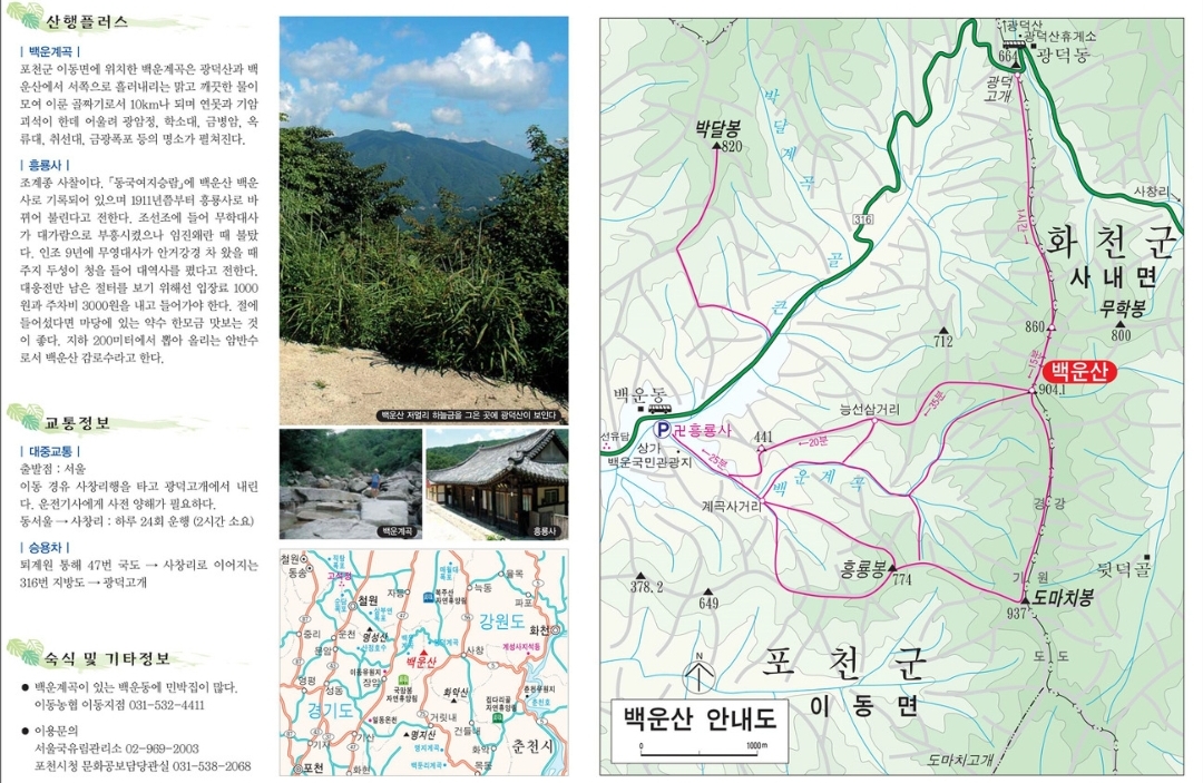 경기도 포천시 이동면과 강원도 화천군 사내면에 걸쳐 있는 산으로, 높이는 1,094미터입니다. 이 산은 사계절마다 아름다운 자연경관을 제공하며, 특히 봄의 야생화, 여름의 푸른 숲, 가을의 단풍, 겨울의 설경이 매력적입니다. 다양한 난이도의 등산로가 있어 많은 등산객들에게 사랑받으며, 고려시대부터 전해 내려오는 역사적 의미를 지니고 있습니다.