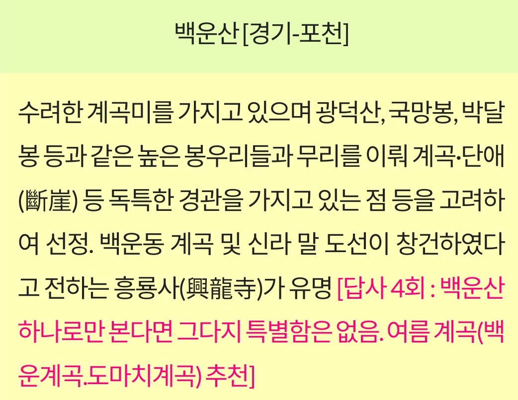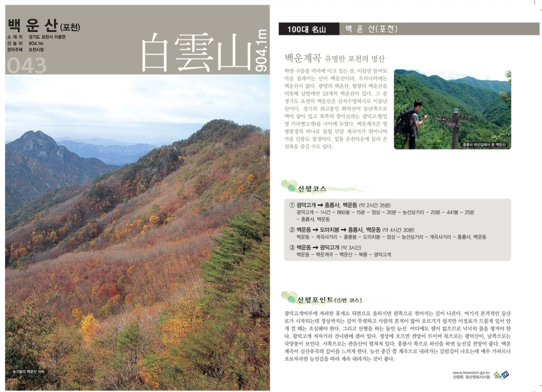 - 역사적 의미: 백운산은 오래된 산사와 전통적인 산행 코스가 있는 곳으로, 지역 주민들 사이에서 신성시되는 산입니다. 또한, 고려시대부터 등산과 관련된 역사적 기록이 남아 있으며, 이곳의 산사와 유적지들은 지역 문화유산으로도 가치가 높습니다.