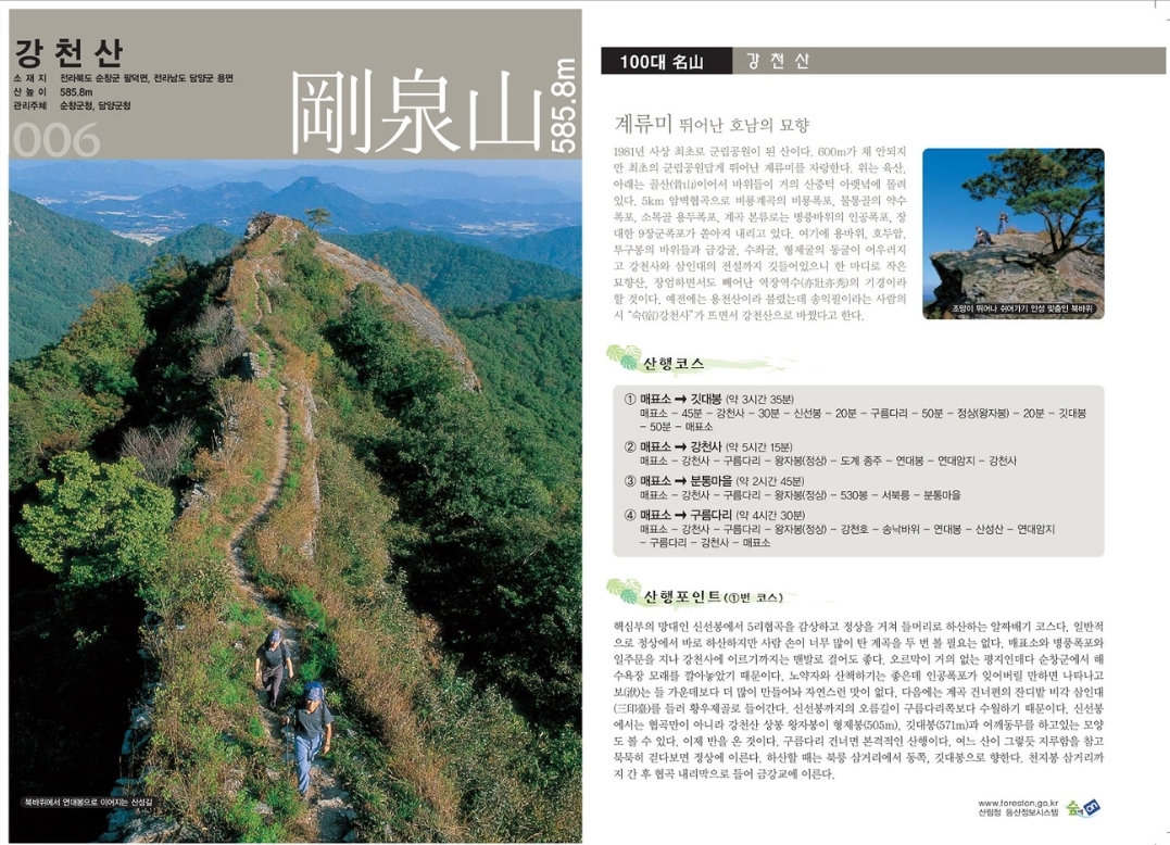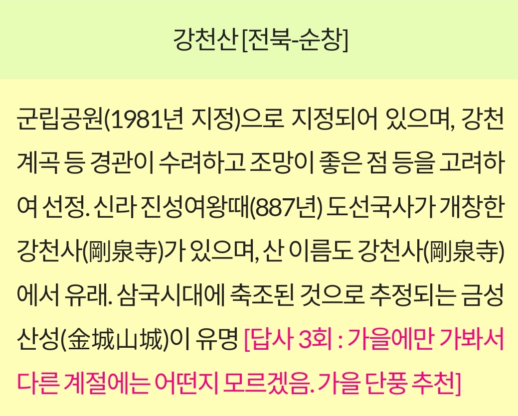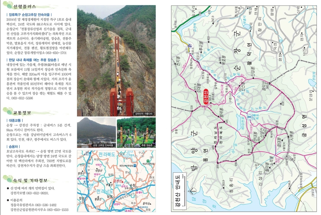 - 문화재 및 사찰: 강천산에는 천년고찰인 강천사가 위치해 있으며, 이 사찰은 신라 말 도선국사가 창건한 것으로 전해집니다. 또한, 전라북도 유형문화재 제27호인 순창 삼인대가 자리하고 있습니다