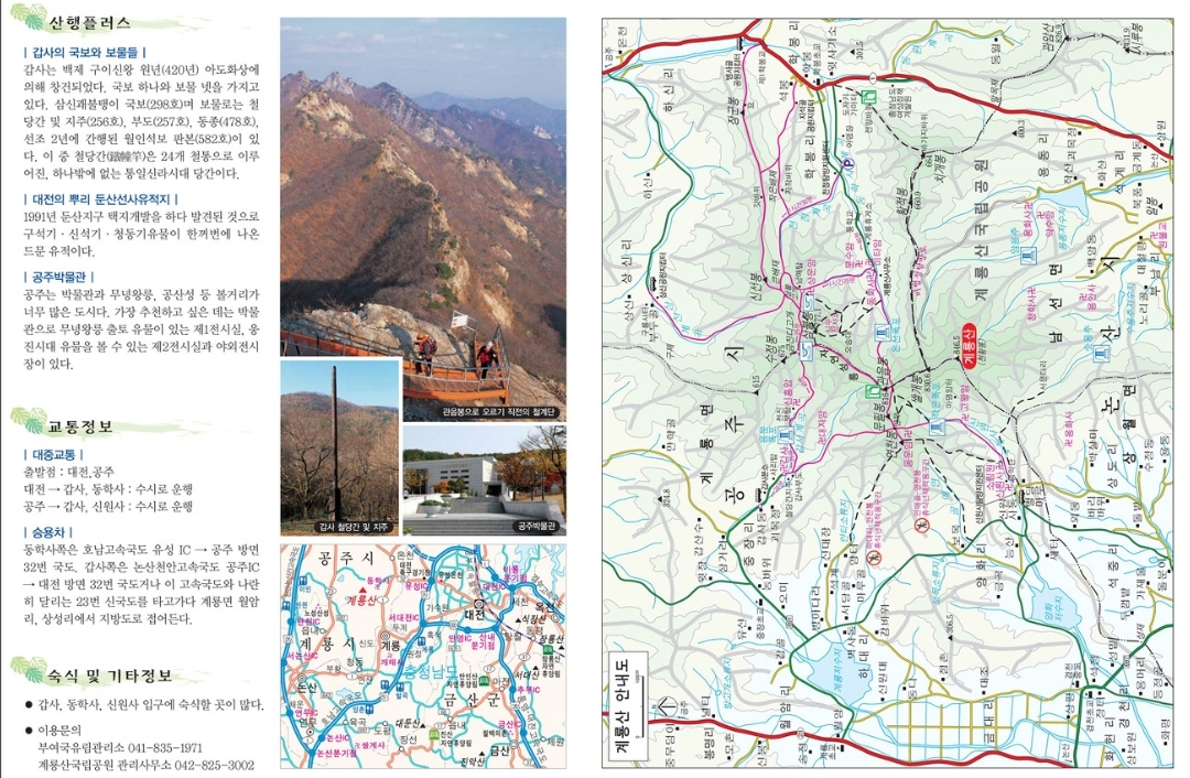 - 등산로: 계룡산에는 여러 등산 코스가 있으며, 대표적인 코스로는 갑사에서 시작하여 관음봉을 거쳐 천황봉에 이르는 길이 있습니다. 이 코스는 약 5시간이 소요되며, 중급 난이도로 평가됩니다. 다른 코스로는 동학사에서 시작하는 코스가 있으며, 이 길은 사찰과 자연경관을 동시에 즐길 수 있습니다.