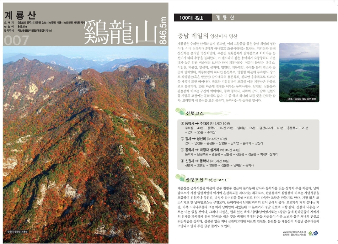 충청남도 공주시, 계룡시, 대전광역시 유성구에 걸쳐 있는 산으로, 높이는 845미터입니다. 이 산은 1968년 대한민국에서 두 번째로 국립공원으로 지정되었습니다.