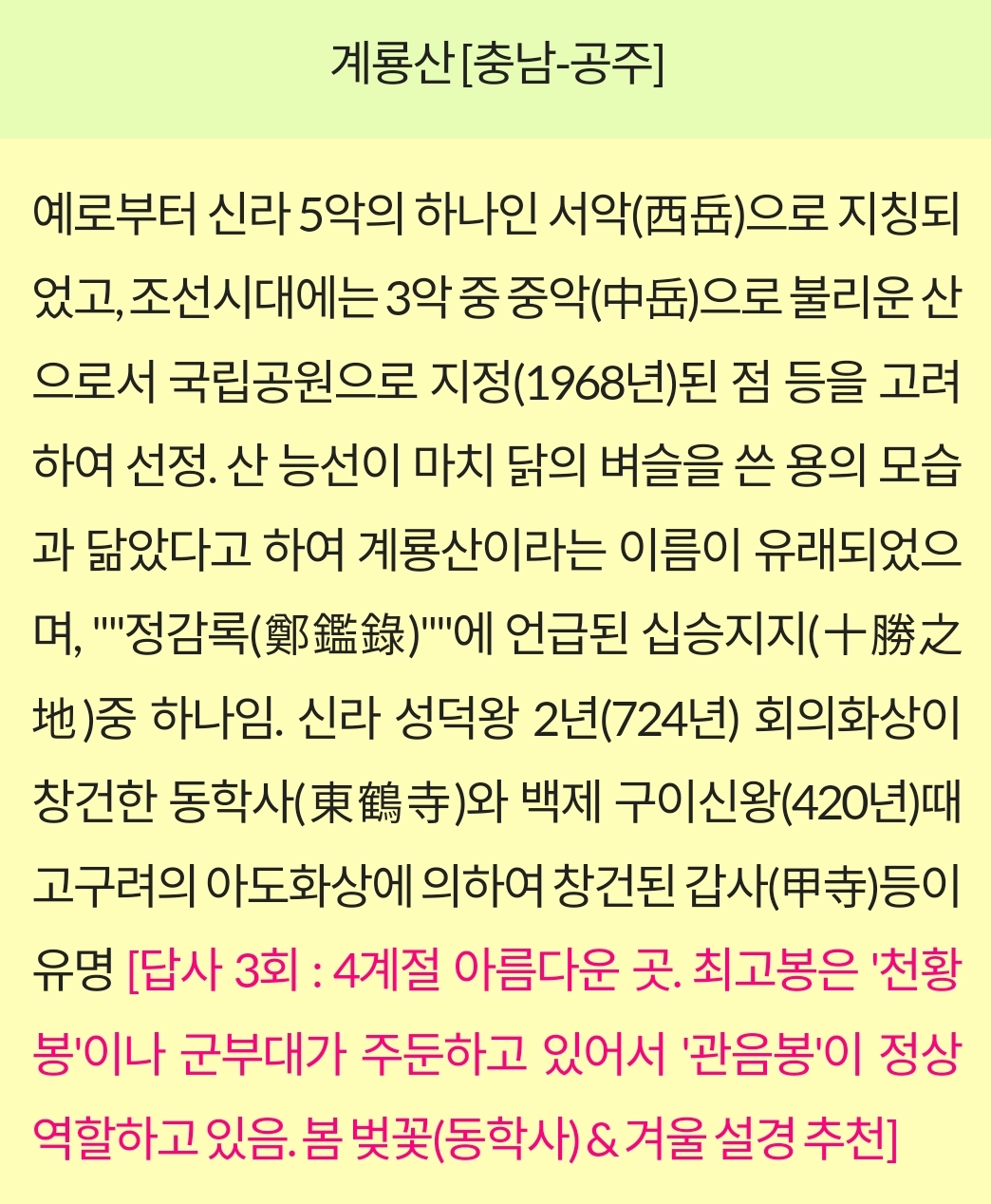계룡산은 그 아름다운 자연경관과 풍부한 역사적, 문화적 자원으로 인해 많은 등산객과 관광객들에게 사랑받는 명소입니다.