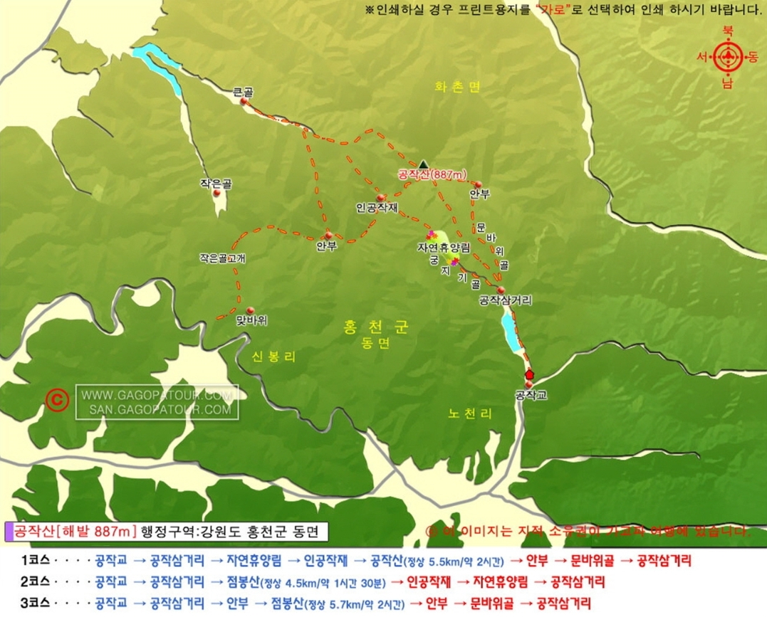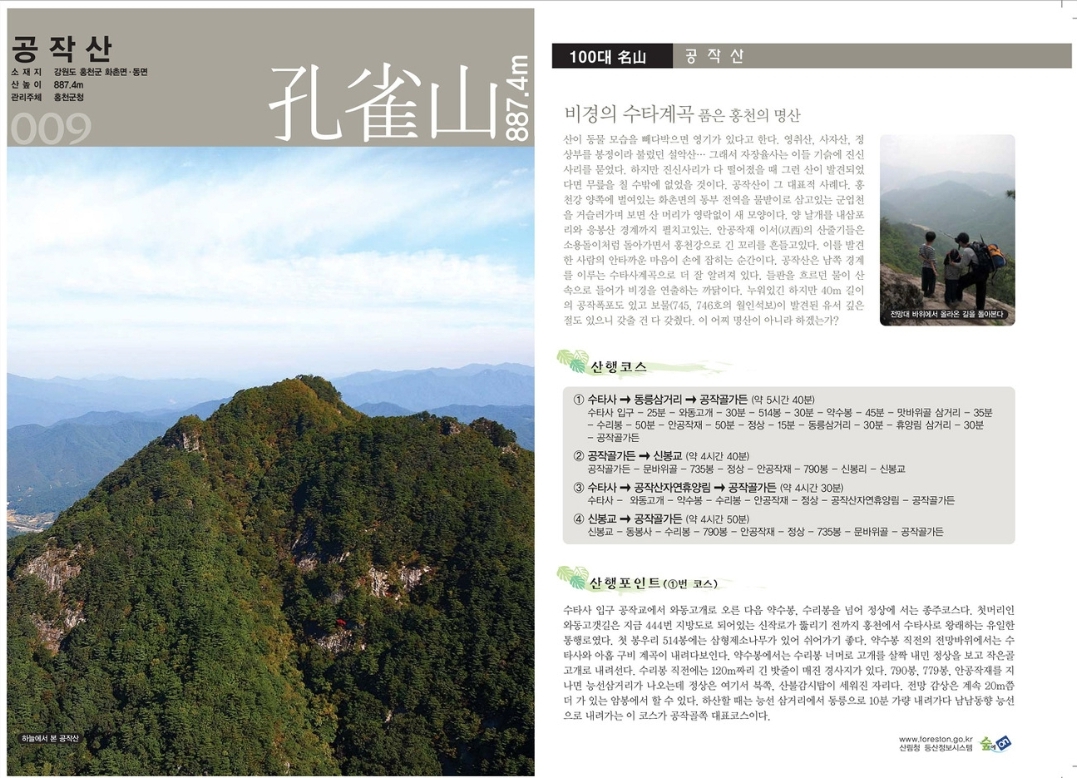 강원도 홍천군 동면과 화촌면에 걸쳐 있는 산으로, 높이는 887미터입니다. 이 산은 풍치가 아름다워 공작이 날개를 펼친 것 같다는 의미에서 이름이 붙여졌습니다.