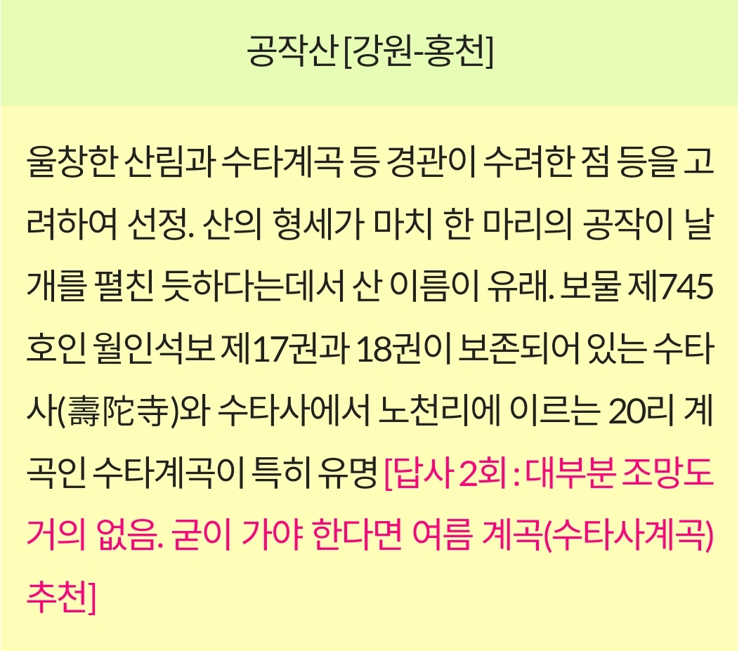 - 자연경관: 공작산은 산림청 선정 100대 명산 중 하나로, 울창한 산림과 수타계곡, 공작저수지 등의 자연경관이 뛰어납니다. 특히 가을철 단풍이 아름다워 많은 등산객들이 찾습니다.
